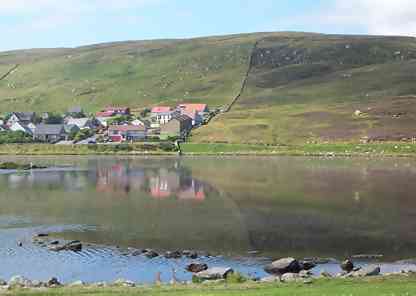 The line separating development and civilisation from the bare moor is reflected in Clickimin Loch. Shetland.